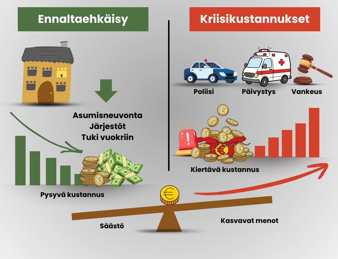 Asunto on julkiselle taloudelle ennaltaehkäisevä kustannus. Pieni varhainen panostus estää moninkertaiset korjaavat, kriisipalvelujen kaltaiset menot myöhemmin.