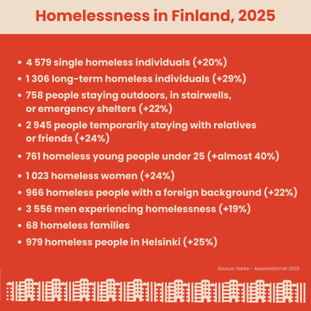 At the end of 2025, there were 4,579 single-person homeless people in Finland. The number of people experiencing homelessness has increased for the second consecutive year, following more than a decade of decline. Street homelessness has risen particularly sharply in the largest cities. A total of 758 people slept outdoors, in stairwells, or in emergency shelters, with the relative increase being highest among long-term homeless individuals.